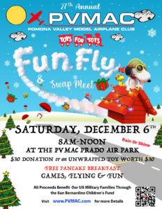 The Pomona Valley Model Airplane Club is a non-profit organization dedicated to promoting the hobby of RC aviation through public outreach and community engagement. The club offers a welcoming environment for enthusiasts of all ages and skill levels, providing access to flying fields, training sessions, and educational workshops. They organize events such as air shows, demonstrations, and hands-on experiences for the public to foster interest in aeronautics and engineering. Additionally, the club partners with local schools and youth organizations to introduce young people to the principles of flight, aiming to inspire the next generation of pilots and aerospace professionals. The club is committed to safety, responsible flying, and fostering a sense of community among members and the broader public.